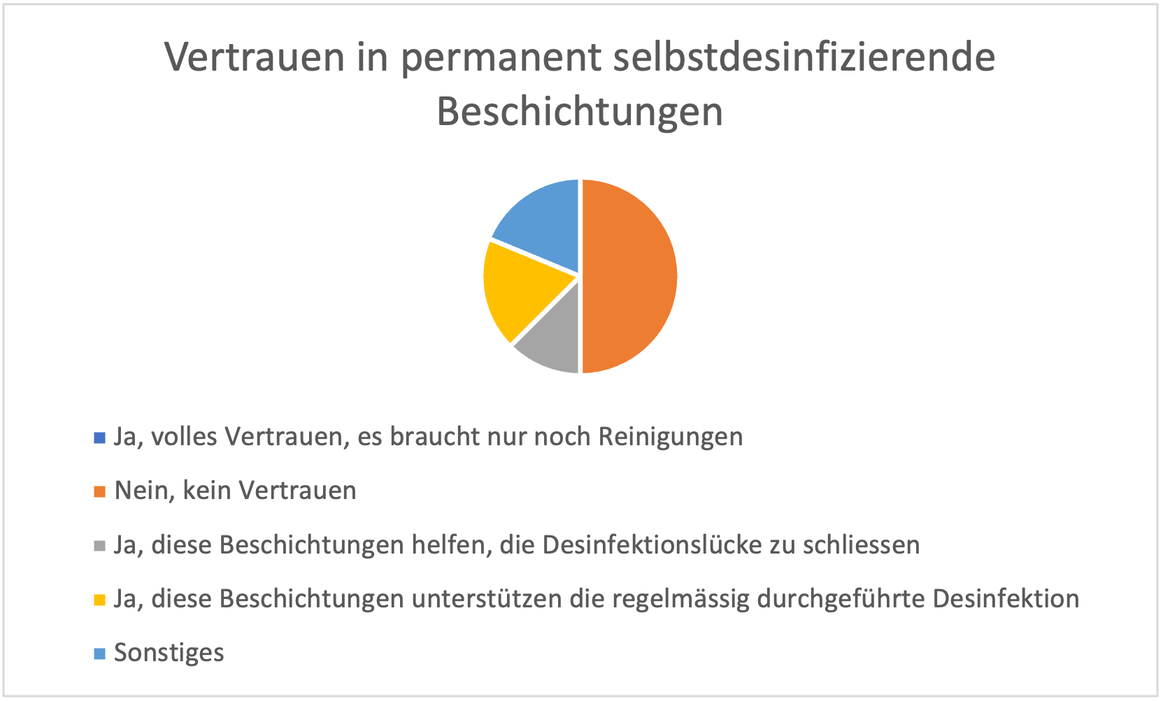 Hätten Sie Vertrauen in Beschichtungen mit permanent selbstdesinfizierenden Eigenschaften für High Touch Areas? 50% der Antworten fallen negativ aus, die anderen 1/3 sehen einen Benefit (Schliessen der Desinfektionslücke, Unterstützung bei der regelmässigen Desinfektion).